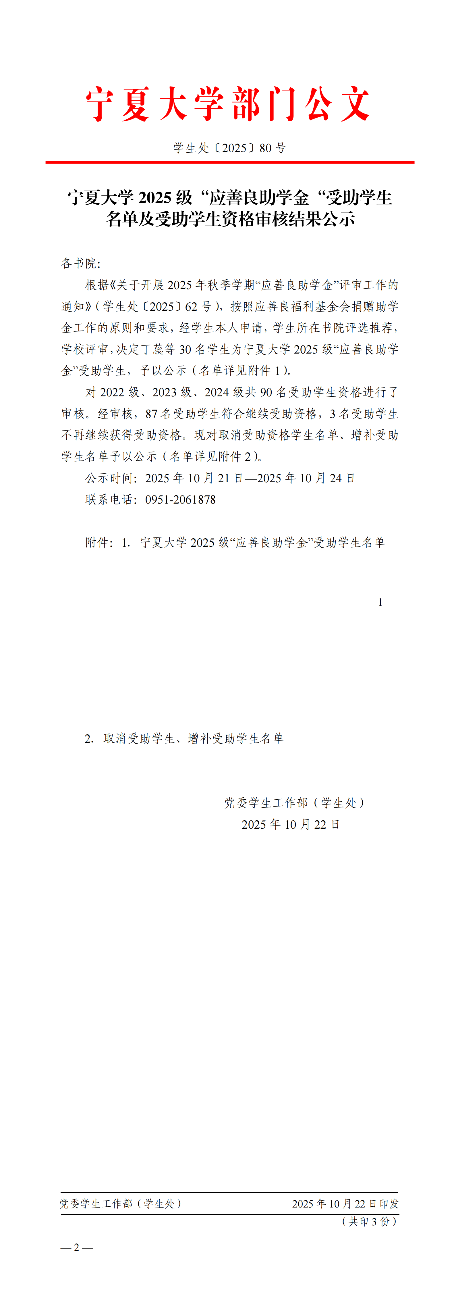 宁夏大学2025级“应善良助学金“受助学生名单及受助学生资格审核结果公示(学生处〔2025〕80号)