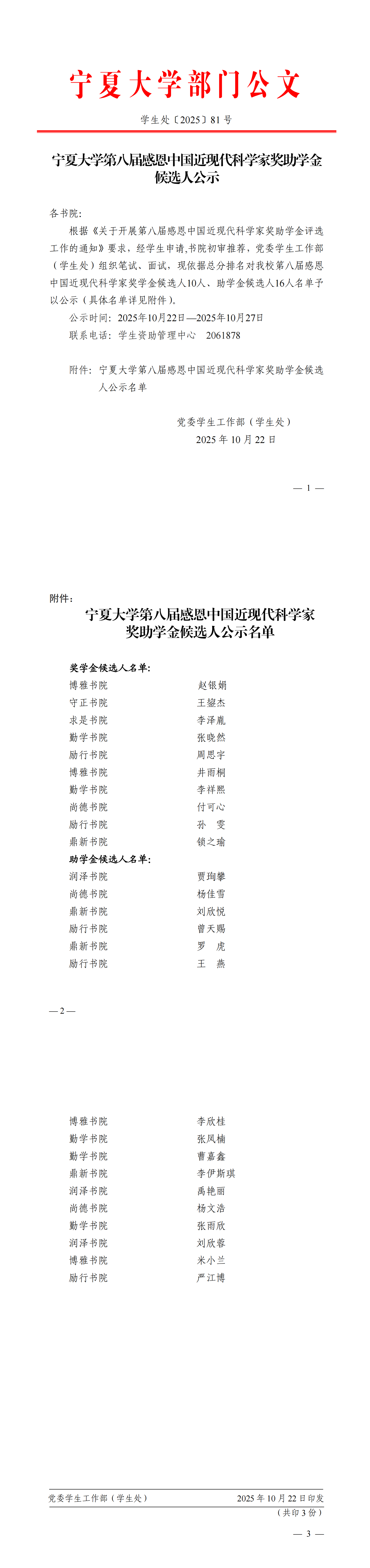 宁夏大学第八届感恩中国近现代科学家奖助学金候选人公示(学生处〔2025〕81号)