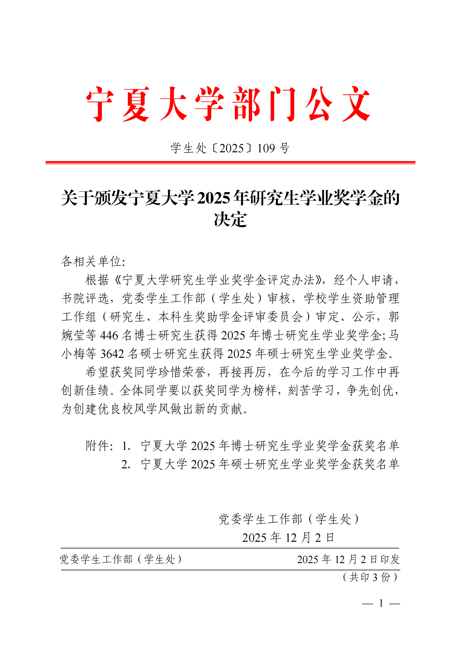 关于颁发宁夏大学2025年研究生学业奖学金的决定(学生处〔2025〕109号)