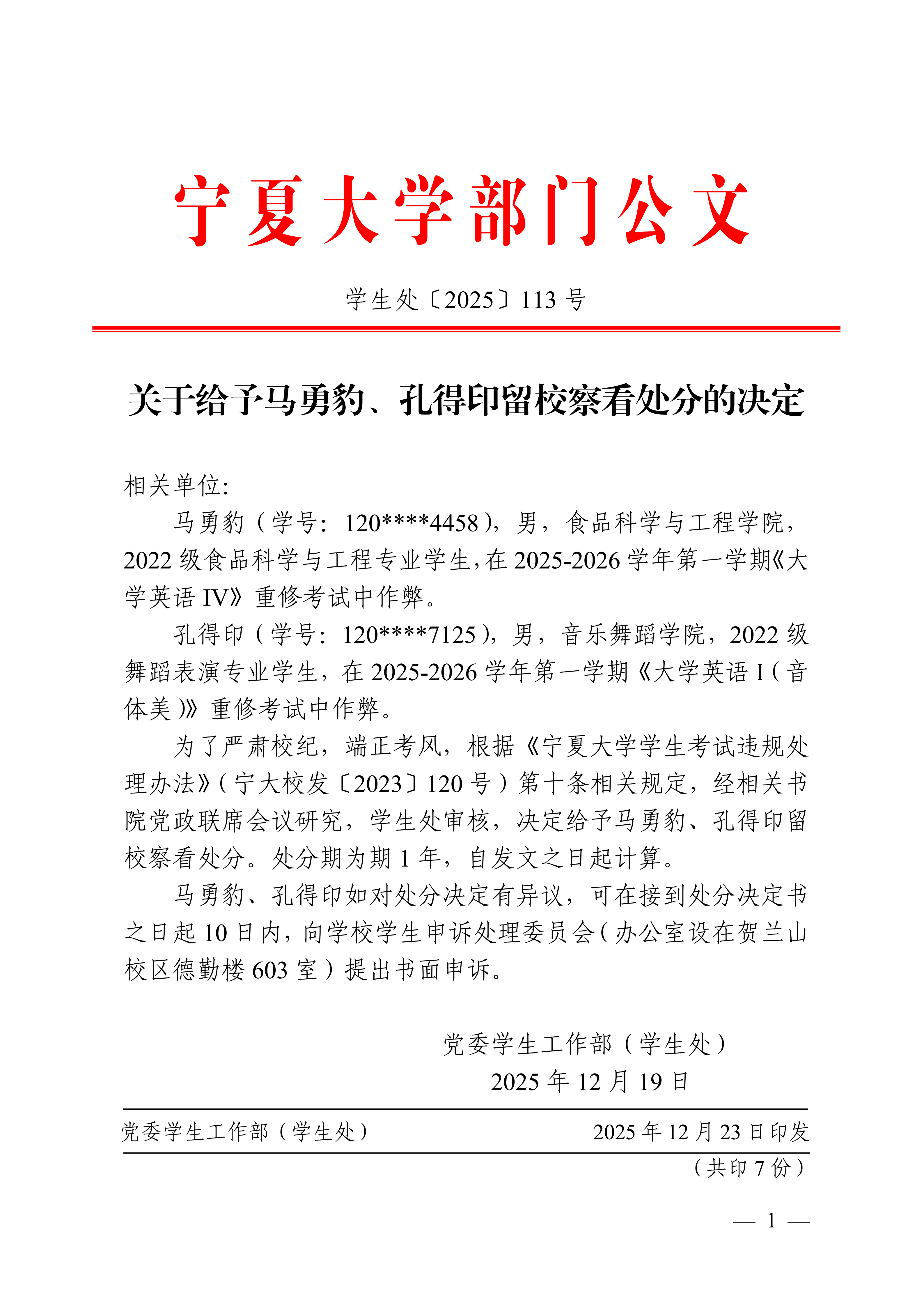 关于给予马勇豹、孔得印留校察看处分的决定(学生处〔2025〕113号)