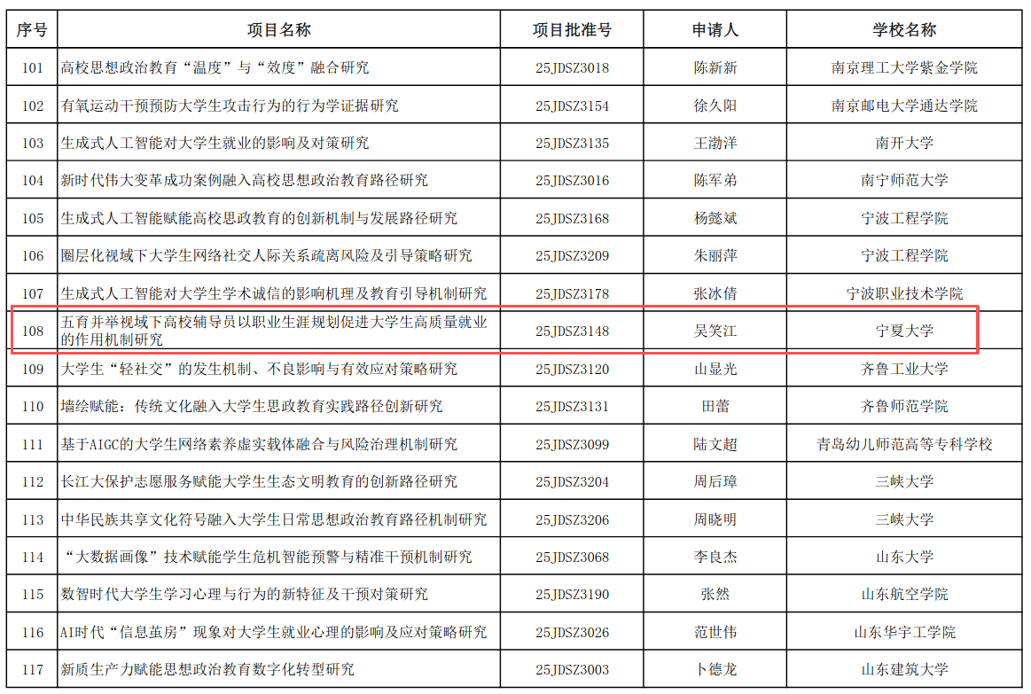近日,教育部社会科学司正式公布了2025年度教育部人文社会科学研究专项任务项目(高校辅导员研究)立项结果。经专家严格评审、社会公示等程序,我校博雅书院吴笑江老师申报的课题《五育并举视域下高校辅导员以职业生涯规划促进大学生高质量就业的作用机制研究》(项目批准号:25JDSZ3148)成功获批立项。此次获批,是我校在高校辅导员队伍建设与专业化、职业化发展领域取得的又一重要突破,彰显了我校辅导员队伍的理论研究水平与实践创新能力。