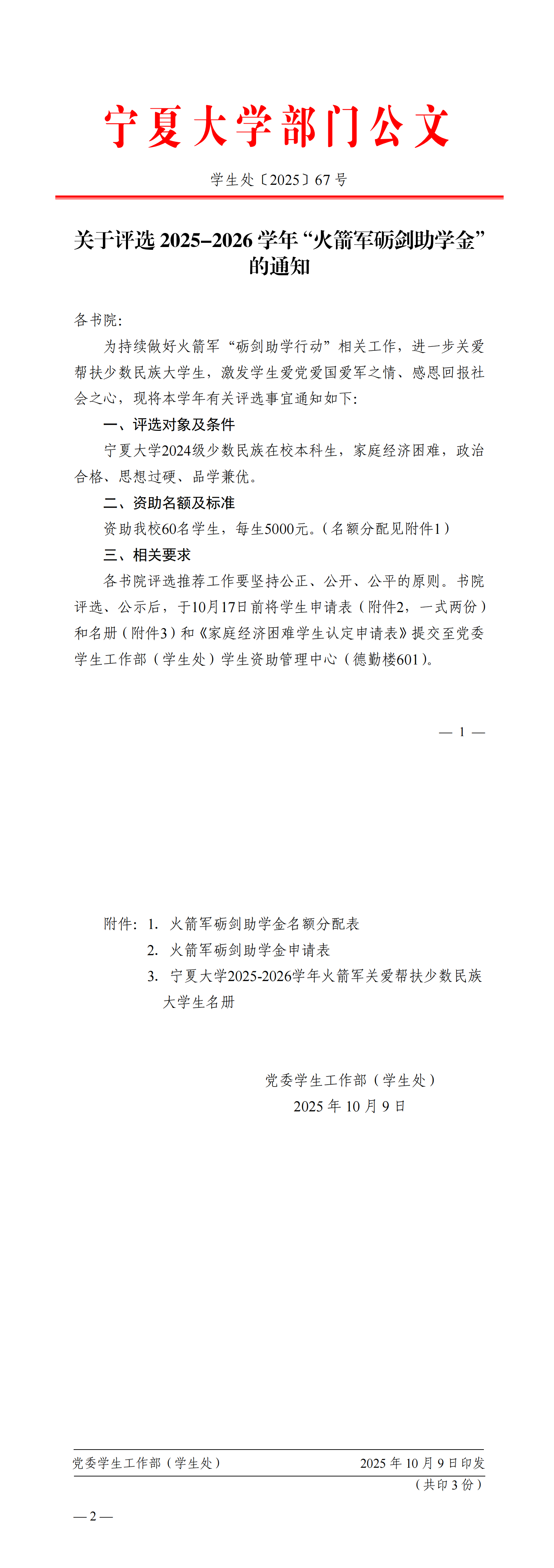 关于评选2025-2026学年“火箭军砺剑助学金”的通知(学生处〔2025〕67号)