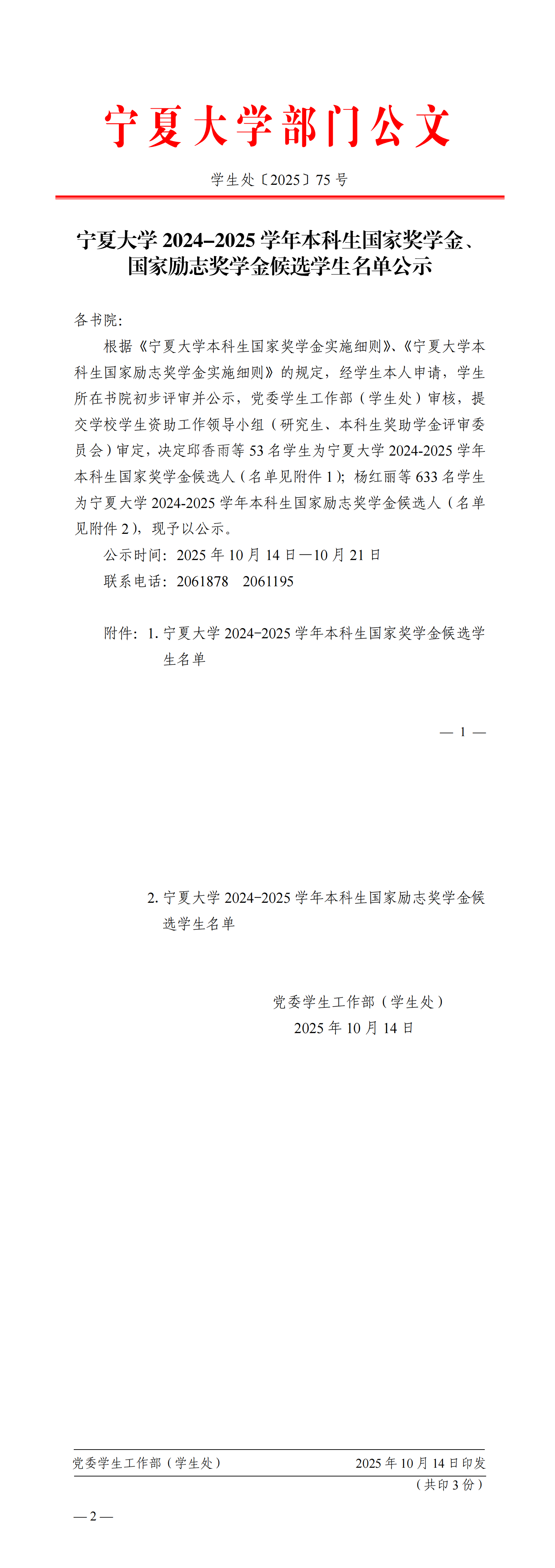宁夏大学2024-2025学年本科生国家奖学金、国家励志奖学金候选学生名单公示(学生处〔2025〕75号)
