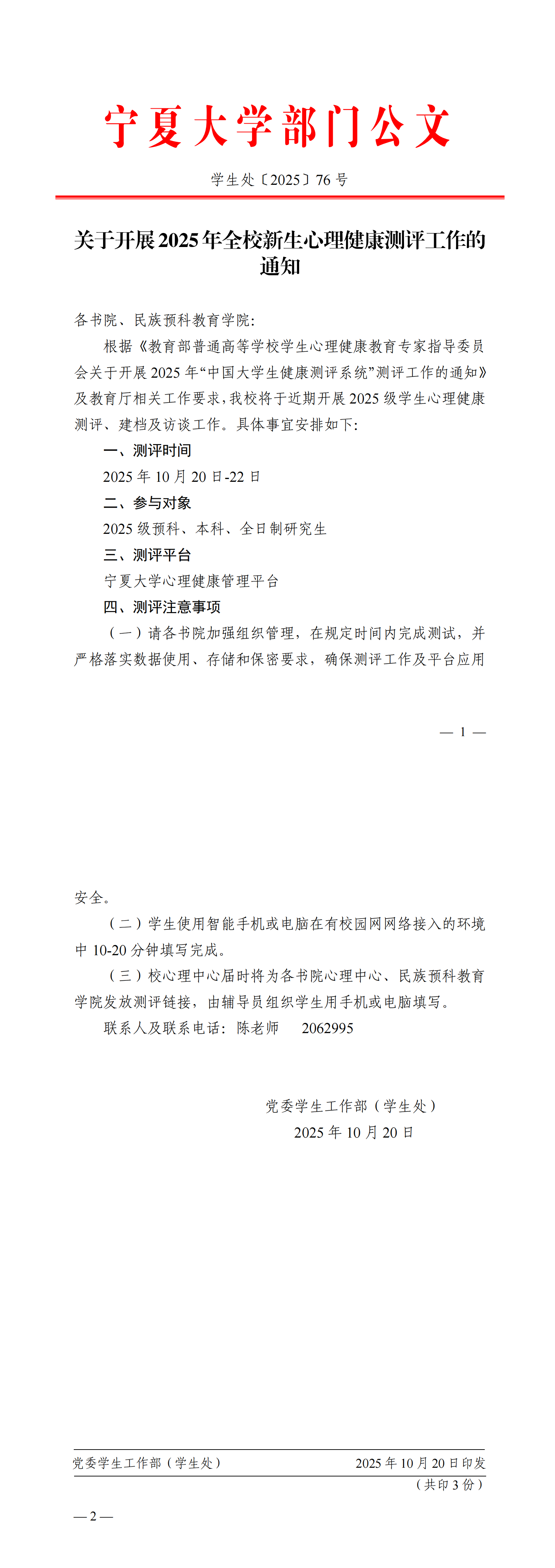 关于开展2025年全校新生心理健康测评工作的通知(学生处〔2025〕76号)