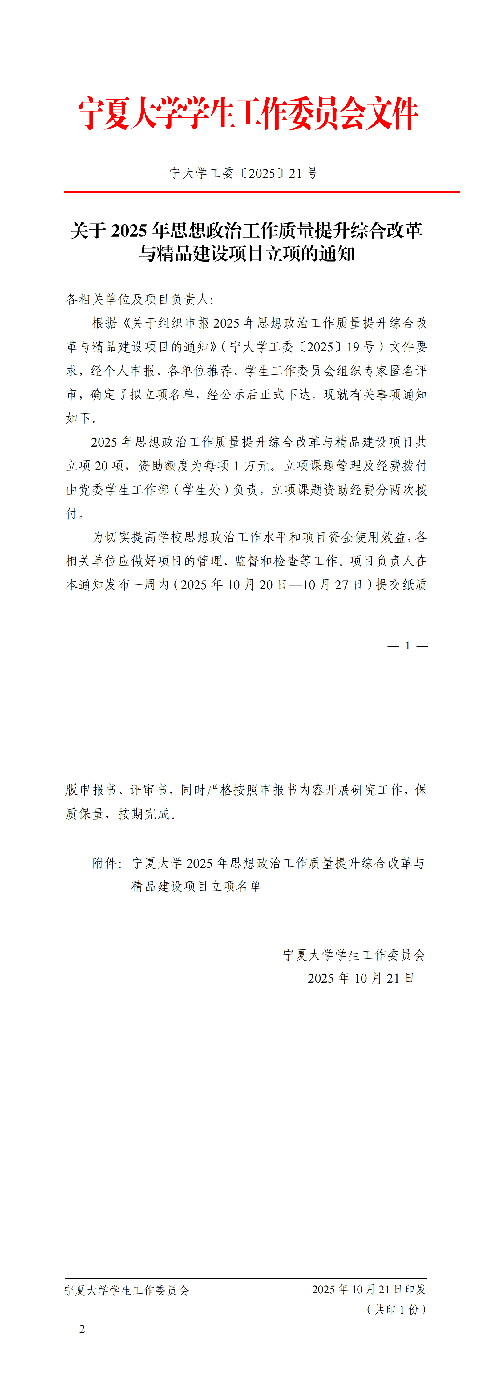 关于2025年思想政治工作质量提升综合改革与精品建设项目立项的通知(宁大学工委〔2025〕21号)