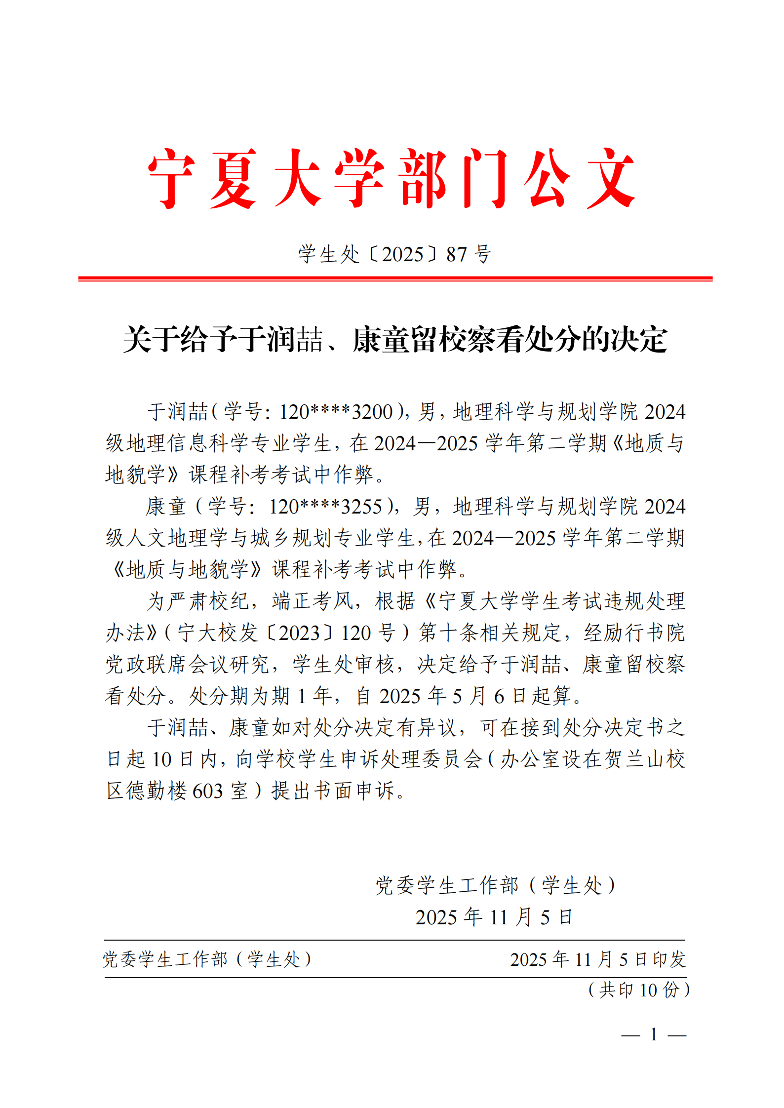 关于给予于润喆、康童留校察看处分的决定(学生处〔2025〕87号)