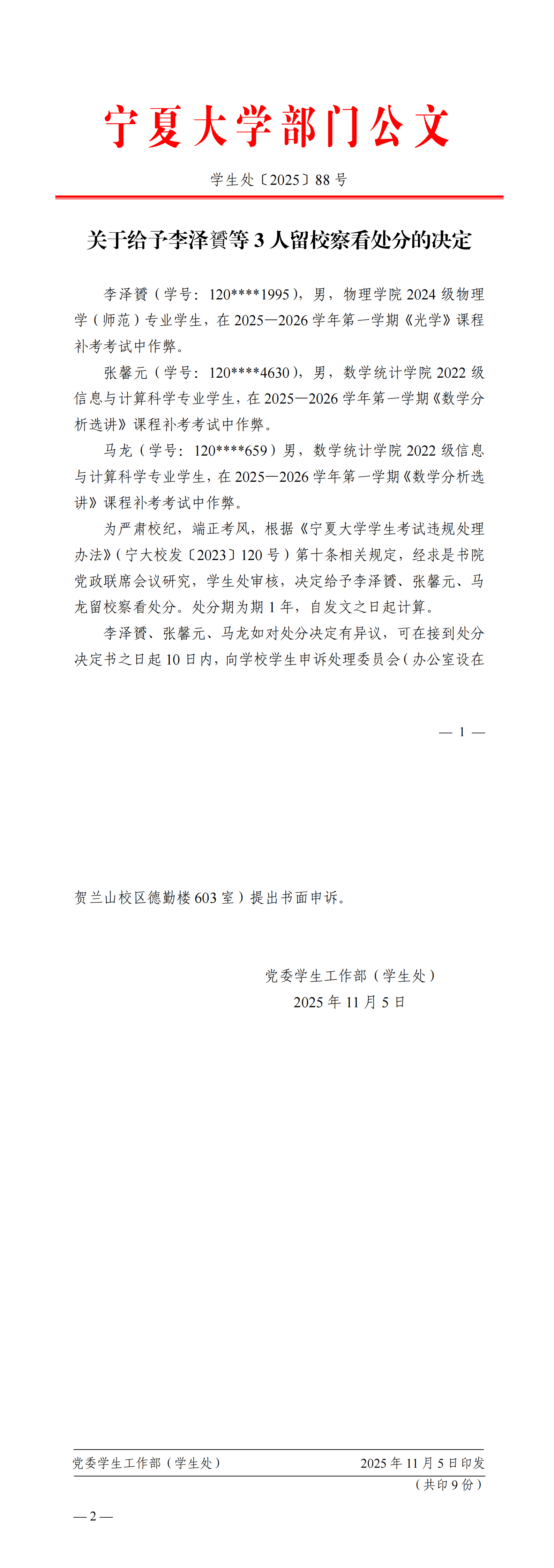 关于给予李泽贇等3人留校察看处分的决定(学生处〔2025〕88号)