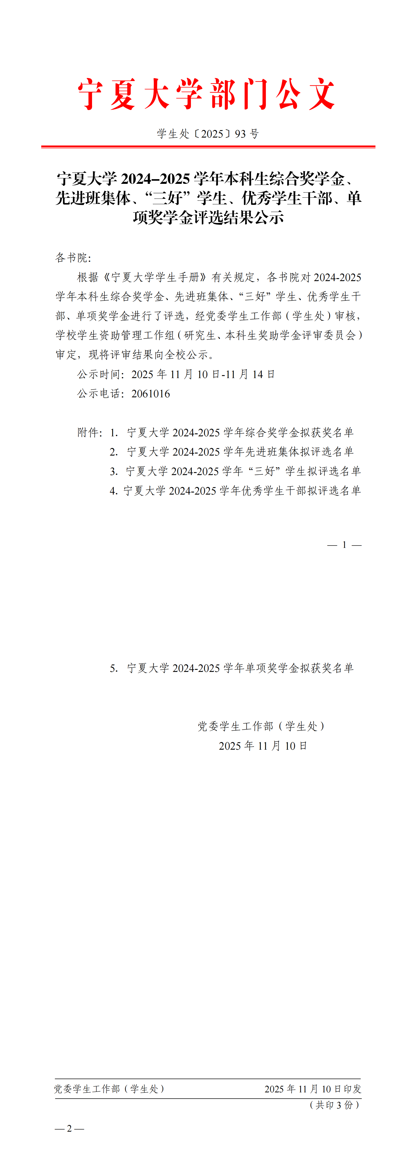 宁夏大学2024-2025学年本科生综合奖学金、先进班集体、“三好”学生、优秀学生干部、单项奖学金评选结果公示(学生处〔2025〕93号)