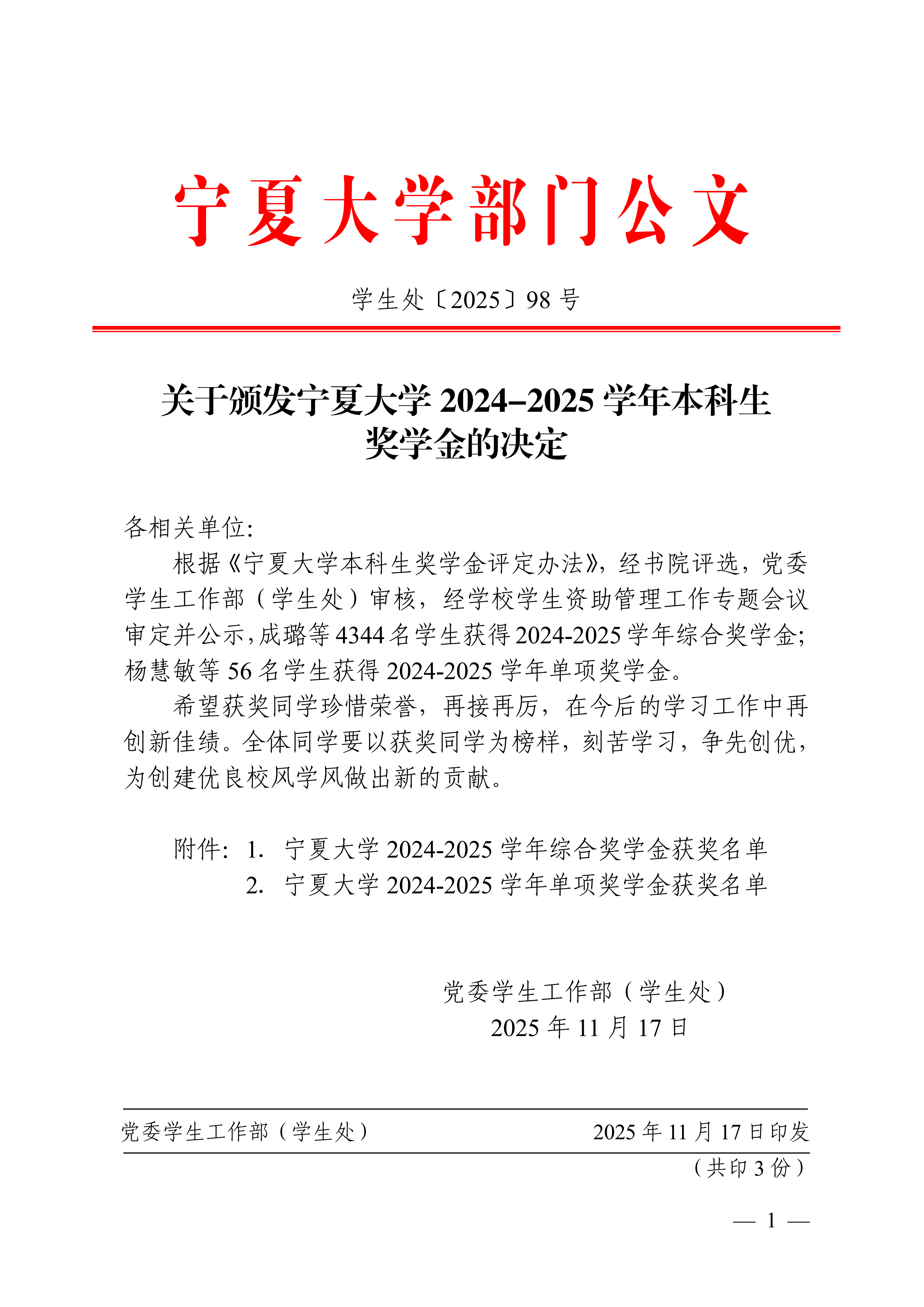 关于颁发宁夏大学2024-2025学年本科生奖学金的决定(学生处〔2025〕98号)
