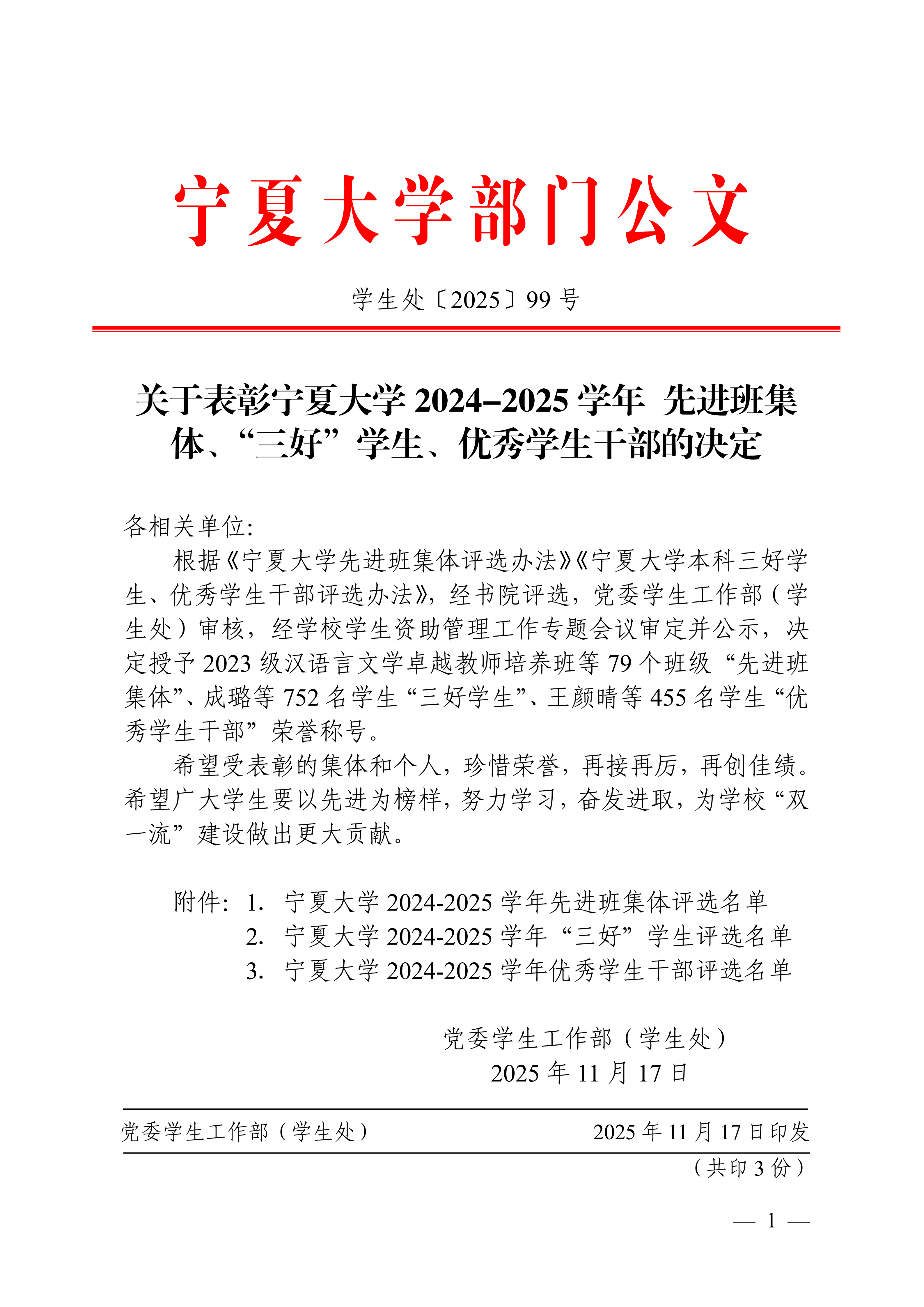 关于表彰宁夏大学2024-2025学年 先进班集体、“三好”学生、优秀学生干部的决定(学生处〔2025〕99号)