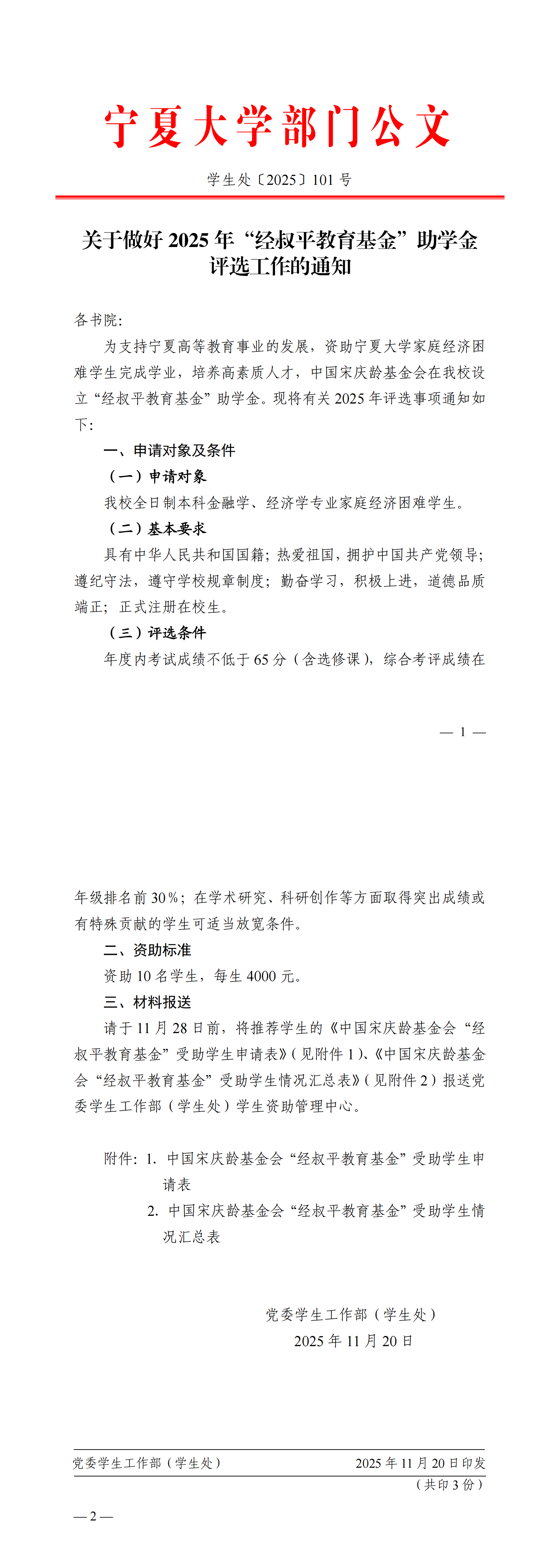 关于做好2025年“经叔平教育基金”助学金评选工作的通知(学生处〔2025〕101号)