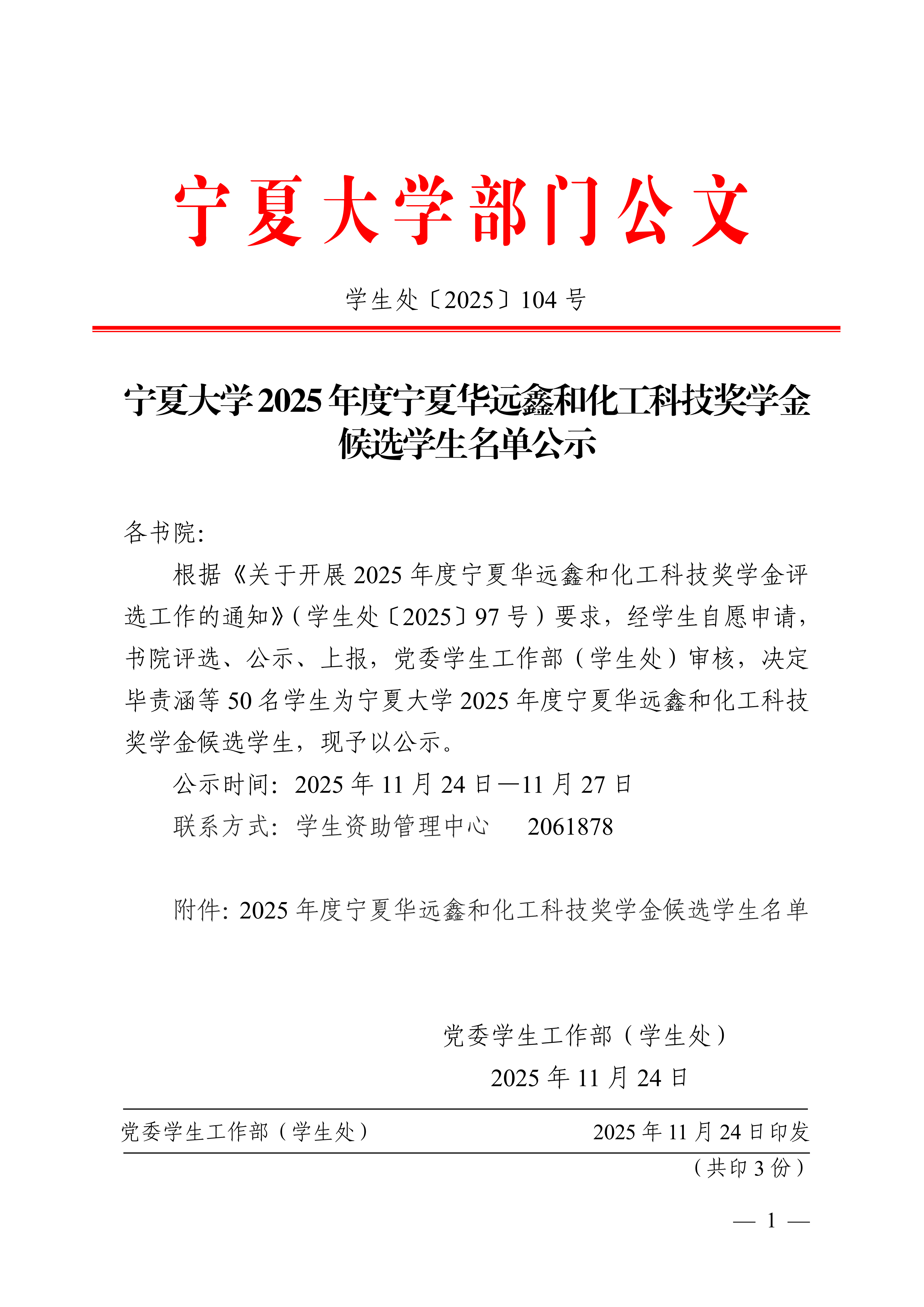 宁夏大学2025年度宁夏华远鑫和化工科技奖学金候选学生名单公示(学生处〔2025〕104号)