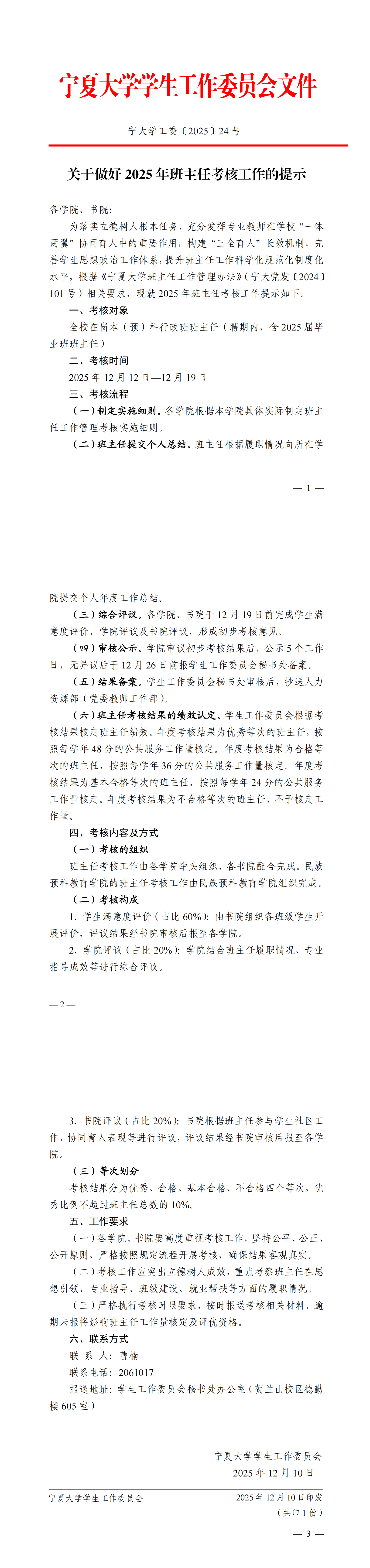 关于做好2025年班主任考核工作的提示(宁大学工委〔2025〕24号)