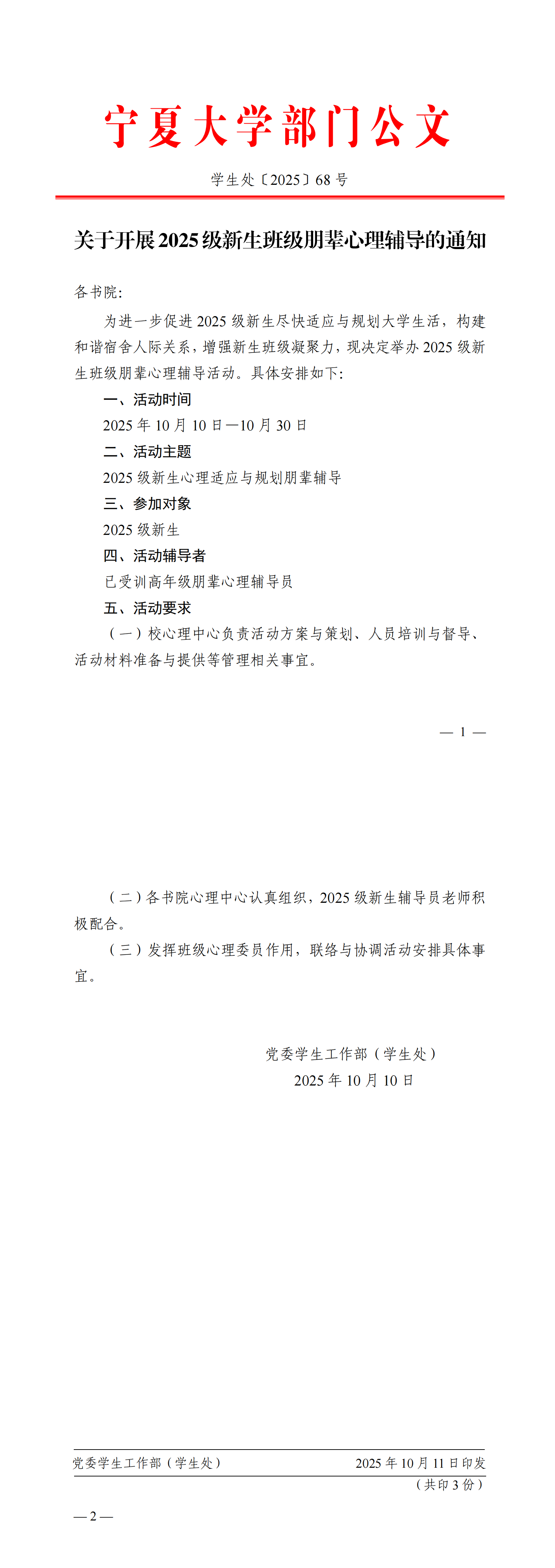 关于开展2025级新生班级朋辈心理辅导的通知(学生处〔2025〕68号)