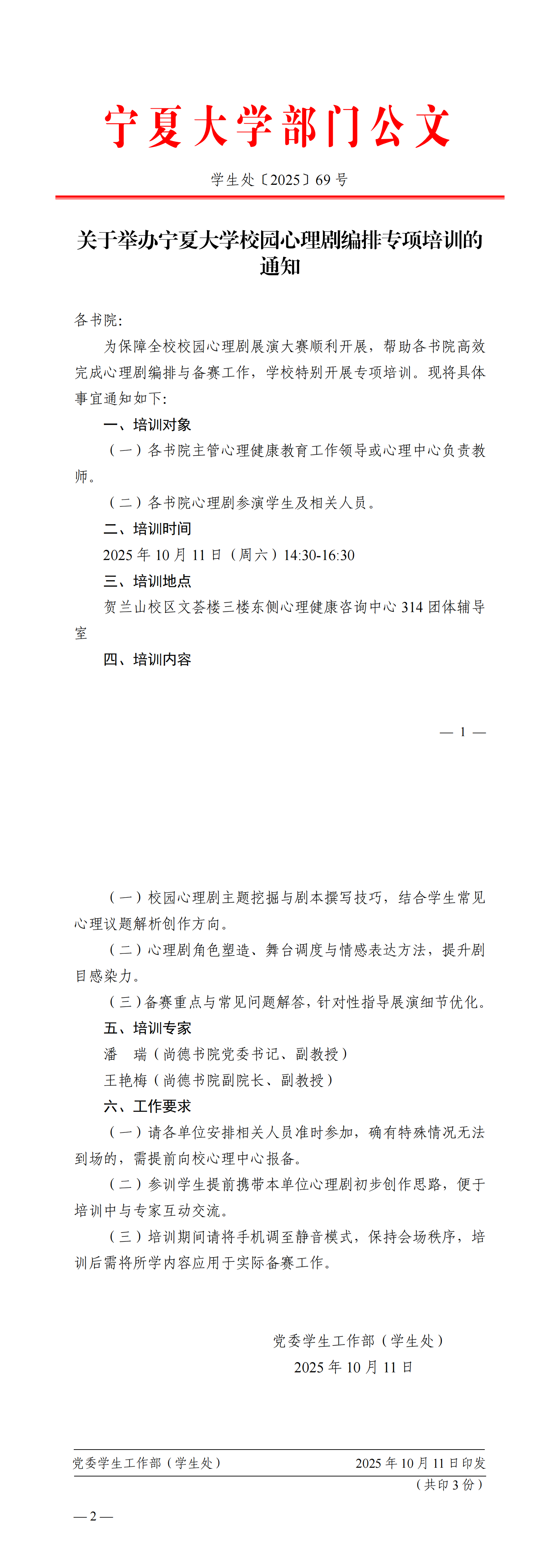 关于举办宁夏大学校园心理剧编排专项培训的通知(学生处〔2025〕69号)