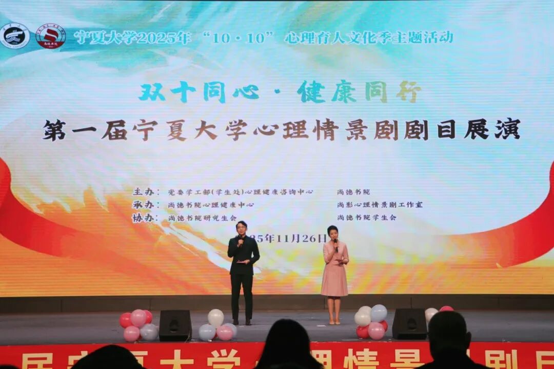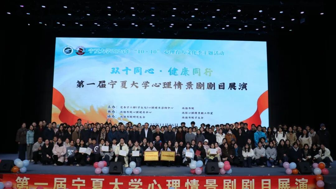 我校2025年“10·10”心理育人文化季期间,为丰富心理育人载体,营造积极健康的校园氛围,11月26日下午,由宁夏大学学生心理健康咨询中心主办的宁夏大学第一届心理情景剧剧目展演在文萃校区大学生活动中心温情启幕。自治区教育厅学生处、宁夏医科大学、宁夏师范大学、北方民族大学、宁夏工商职业技术大学、宁夏工业职业学院、银川能源学院等高校相关部门领导莅临现场,7位宁夏高校心理专家担任评委,各书院近2000名师生齐聚,共赴这场心灵之约。